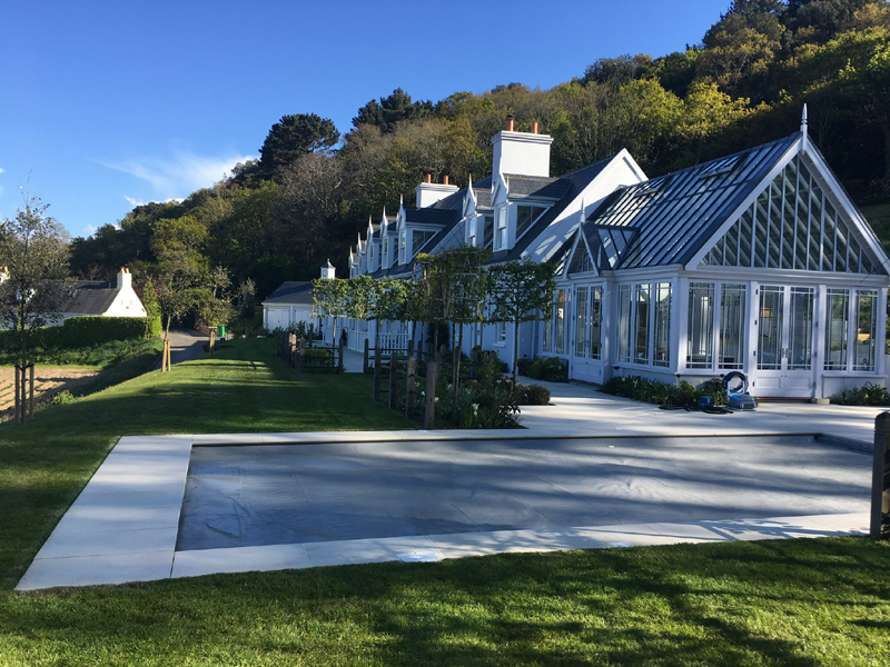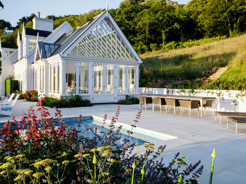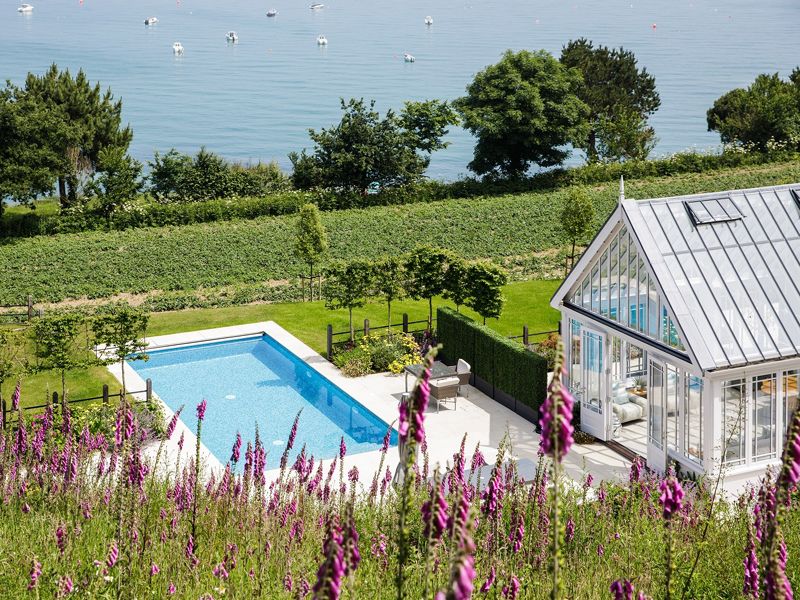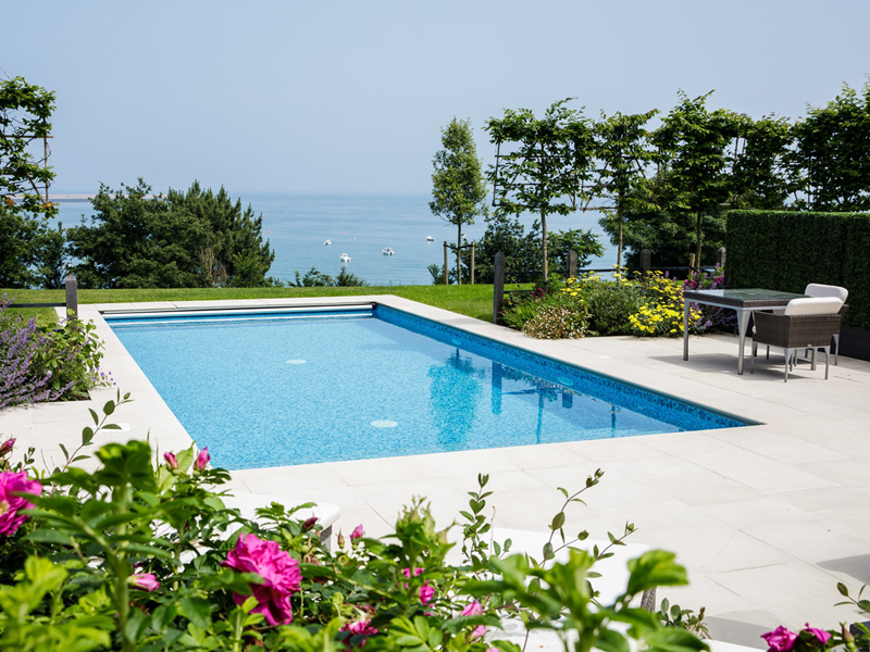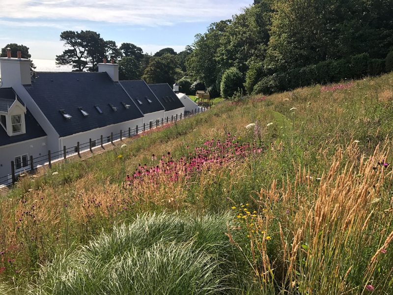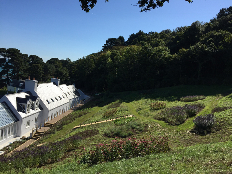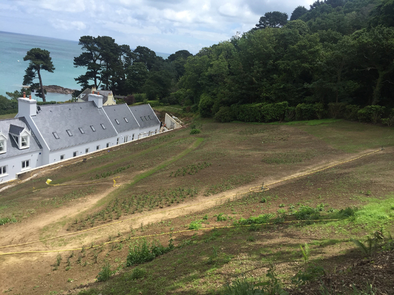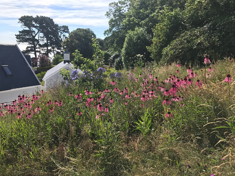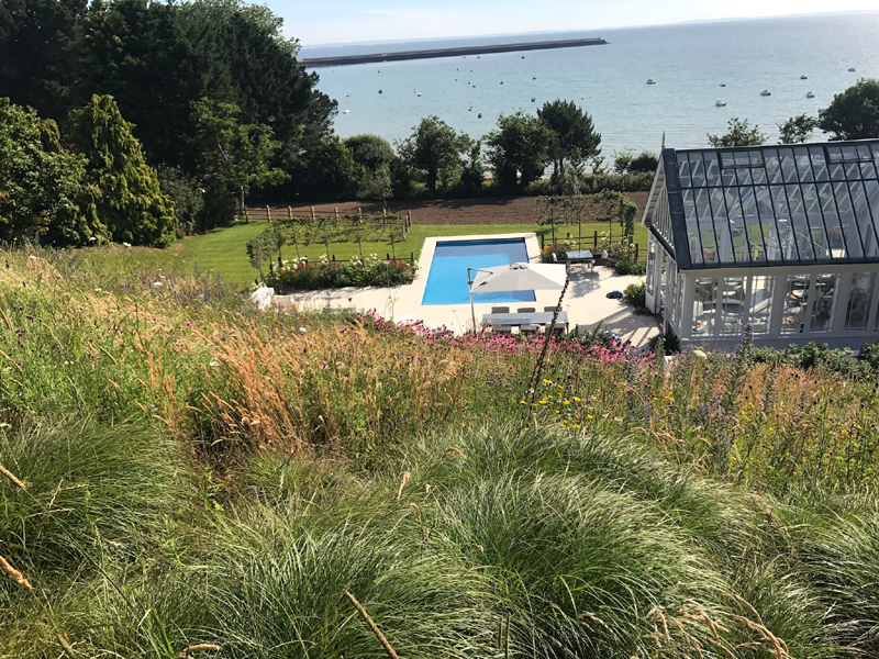 The client's main, level garden is set to the front and side of the property where amazing views look across to the sea. At the back of the house, a steeply sloping field had been designated as a field, with paddock grass due to be seeded. Leaving the hillside as a field seemed a wasted opportunity and we aimed to create something spectacular instead. The clients embraced the challenge and allocated a realistic budget for the project. It was such a huge space to just give over to grass and now, on the richly planted hillside, a winding path leads through prairie planting to a top plateau with seating to look out to sea. The grading of the field took many weeks, but the resulting slope was planted and seeded in two days - with the help of a huge team of Jersey potato planters! Using a select mix of perennials, shipped from the mainland, the planting includes two varieties of Echinacea - in magenta and the palest pink - deep purple salvias, grasses and tall white veronicastrum. The seed to be sown was especially mixed by The Pictorial Meadow company, and many kilos were broadcast over the prepared ground. This provides a mix of purple and white flowers. The hillside will continue to develop and mature over the next few years - eventually providing a spectacular sight, perhaps even from out at sea! The house itself is a fantastic building and the clients had paid great attention to the quality of the build. The main terrace was laid with a sawn sandstone and we used the same paving for the coping stones around the pool. Because of the proximity to a lane, we installed a bespoke fence for safety and designed this to match the weathered oak bollards that lead down to the sea. The steel bands have been powder coated to match the paint colours within the house build. Pleached trees provide an element of privacy without losing the view. These were shipped to site from Barcham Trees in Cambridge. The planting in the borders is designed to give all year structure with colour in the summer. Because of the proximity to the sea, the varieties were chosen to withstand winter gales. The clients have a great entertaining space, with a winding path that leads through the meadow to a top seating area with views out to sea. Much better than a field!