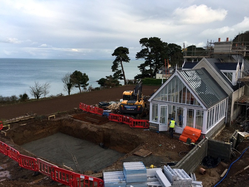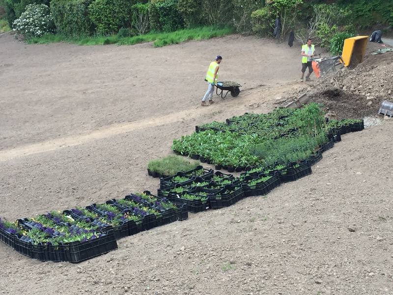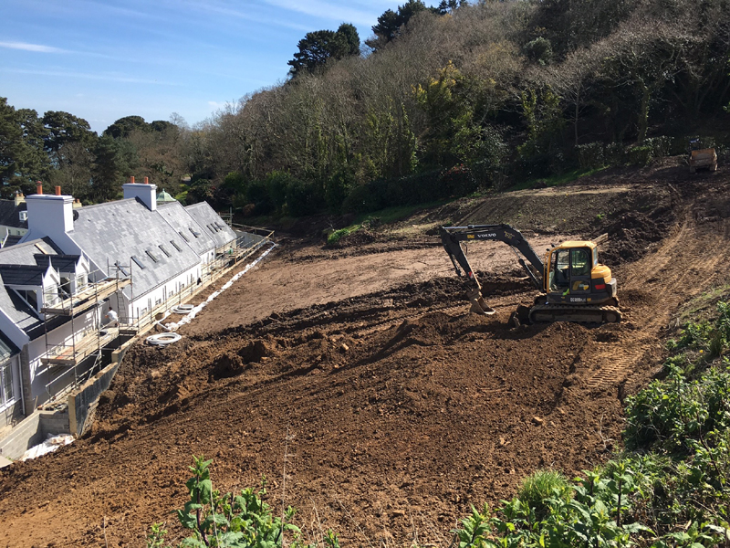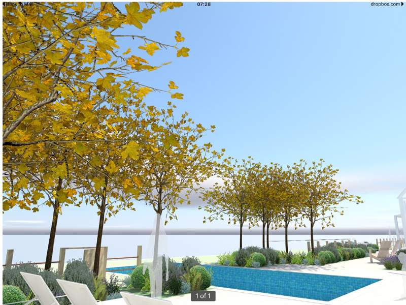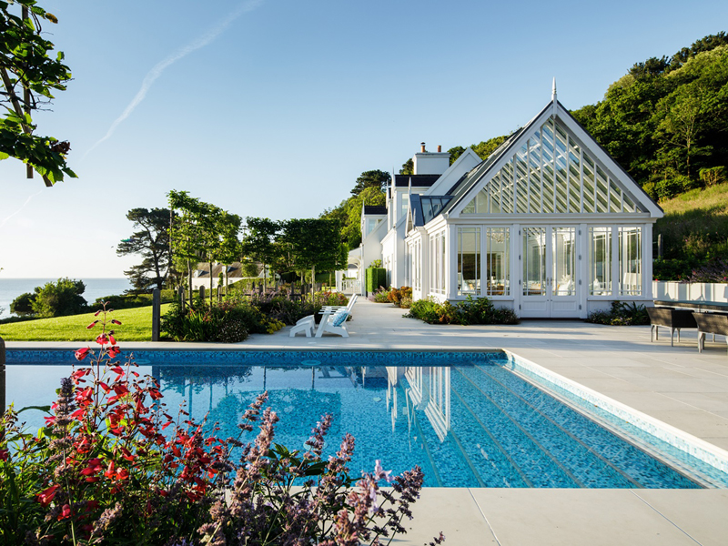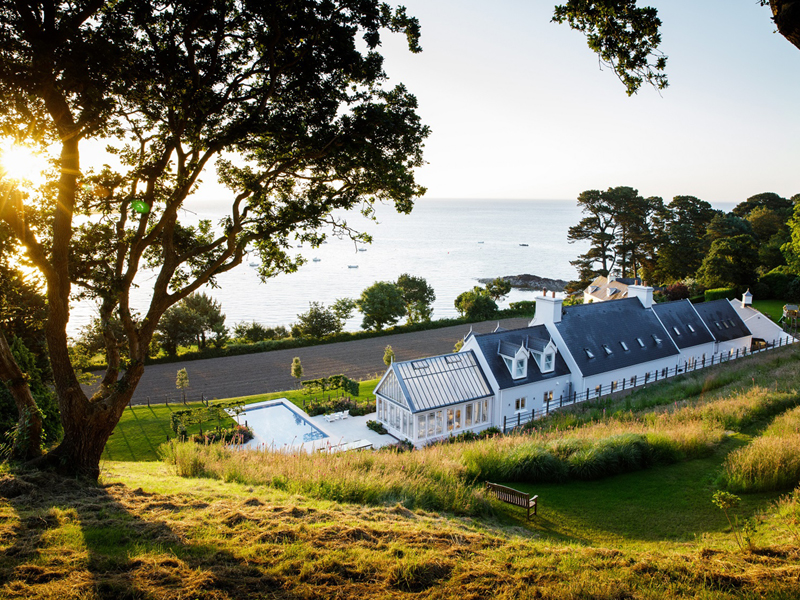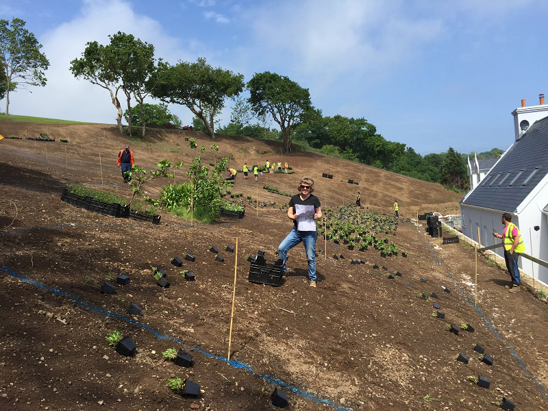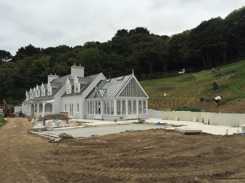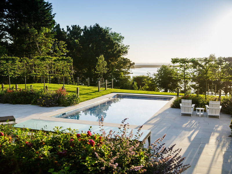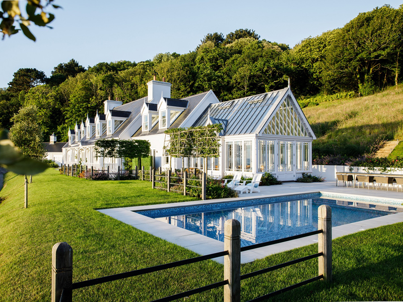 The client's main, level garden is set to the front and side of the property where amazing views look across to the sea. At the back of the house, a steeply sloping field had been designated as a field, with paddock grass due to be seeded. Leaving the hillside as a field seemed a wasted opportunity and we aimed to create something spectacular instead. The clients embraced the challenge and allocated a realistic budget for the project. It was such a huge space to just give over to grass and now, on the richly planted hillside, a winding path leads through prairie planting to a top plateau with seating to look out to sea. The grading of the field took many weeks, but the resulting slope was planted and seeded in two days - with the help of a huge team of Jersey potato planters! Using a select mix of perennials, shipped from the mainland, the planting includes two varieties of Echinacea - in magenta and the palest pink - deep purple salvias, grasses and tall white veronicastrum. The seed to be sown was especially mixed by The Pictorial Meadow company, and many kilos were broadcast over the prepared ground. This provides a mix of purple and white flowers. The hillside will continue to develop and mature over the next few years - eventually providing a spectacular sight, perhaps even from out at sea! The house itself is a fantastic building and the clients had paid great attention to the quality of the build. The main terrace was laid with a sawn sandstone and we used the same paving for the coping stones around the pool. Because of the proximity to a lane, we installed a bespoke fence for safety and designed this to match the weathered oak bollards that lead down to the sea. The steel bands have been powder coated to match the paint colours within the house build. Pleached trees provide an element of privacy without losing the view. These were shipped to site from Barcham Trees in Cambridge. The planting in the borders is designed to give all year structure with colour in the summer. Because of the proximity to the sea, the varieties were chosen to withstand winter gales. The clients have a great entertaining space, with a winding path that leads through the meadow to a top seating area with views out to sea. Much better than a field!