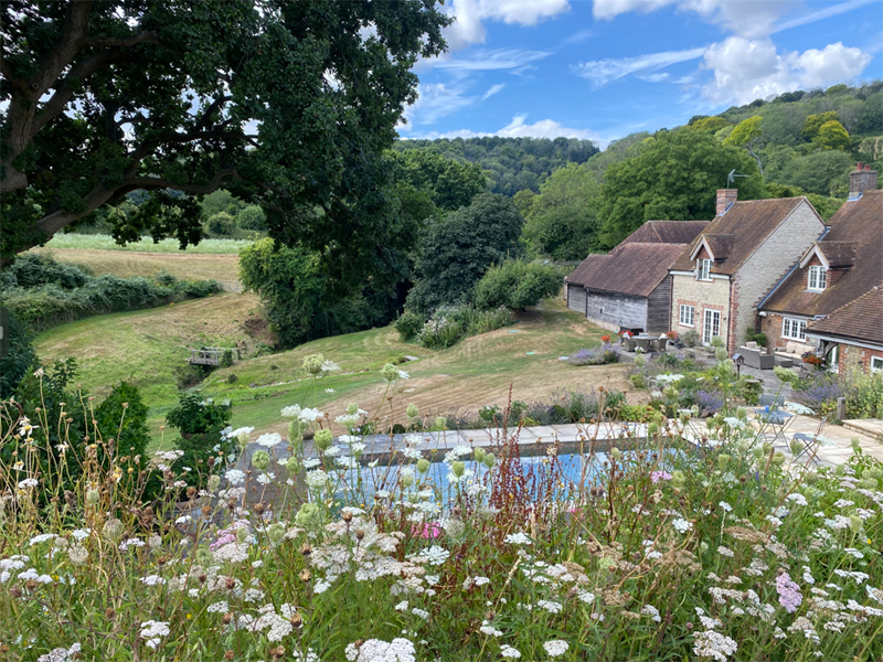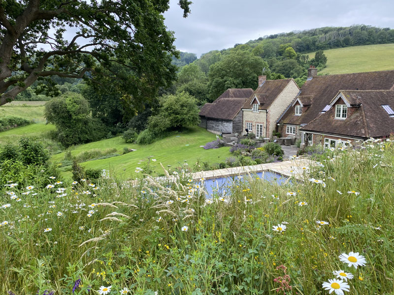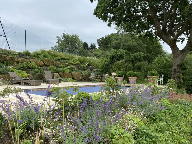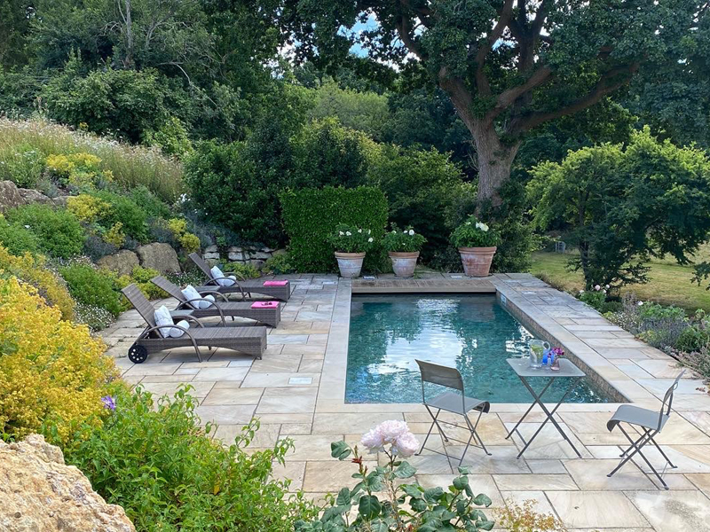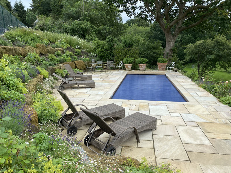 The hillside location for this pool created a number of challenges. Working with Transform Landscapes, we dug out an 8 x 3 metre pool that was lined on site, with an automatic cover. The plant room was set into the steep hillside and we imported massive pieces of stone to retain the resulting banks. Working with the stone we were able to create a natural landscape to enclose this new pool terrace. The land falls away and down to a natural stream and bridge. We planted into the hillside using smaller plants and bulbs that would consolidate the soil. New stone steps led up to the pool and then beyond to the lawn and tennis court above.