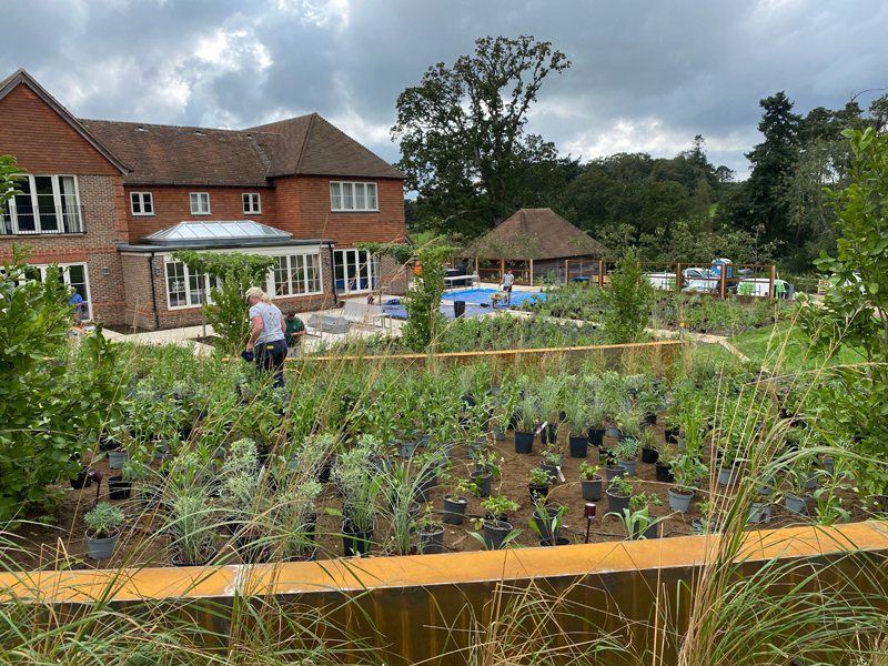Working with the slopes in this garden, we designed curved Corten walls to retain the existing soil. These provide a stunning backdrop to the planting. The plants have been set out in circular sweeps to reflect the arc of the walls and grasses catch the light, accentuating the deep colours of the metalwork. The Corten has been used again to design panels, set between cedar posts and fronted with white flowering cherry trees. The clients have chosen contemporary furniture, set between table top Mulberry trees with a long fire table. The finishing touch is the new Grillo outdoor kitchen. A true entertaining space.