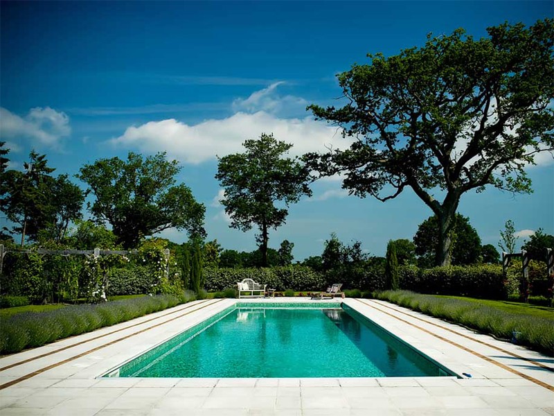 We designed the entire pool area and front driveway to the house along with the terraces. Large, 8" square oak pergolas, constructed in the traditional way with mortice and tenon joints, are covered in English roses, and a long lavender hedge runs the entire length of the pool on both sides. Brick lines were built into the terrace to tie the paving back to the brick farmhouse. Wide steps lead from the drive to the front door and the front of the house is covered with Dublin Bay and Wedding Day roses.